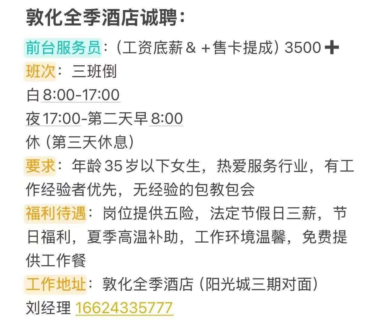 敦化全季酒店招聘前台1人 工作内容和岗位职责看图片 形象好,气质佳,热爱酒店行业,聪明伶俐,平时上班需要站着,有夜班,非诚勿扰。 年龄22-38岁