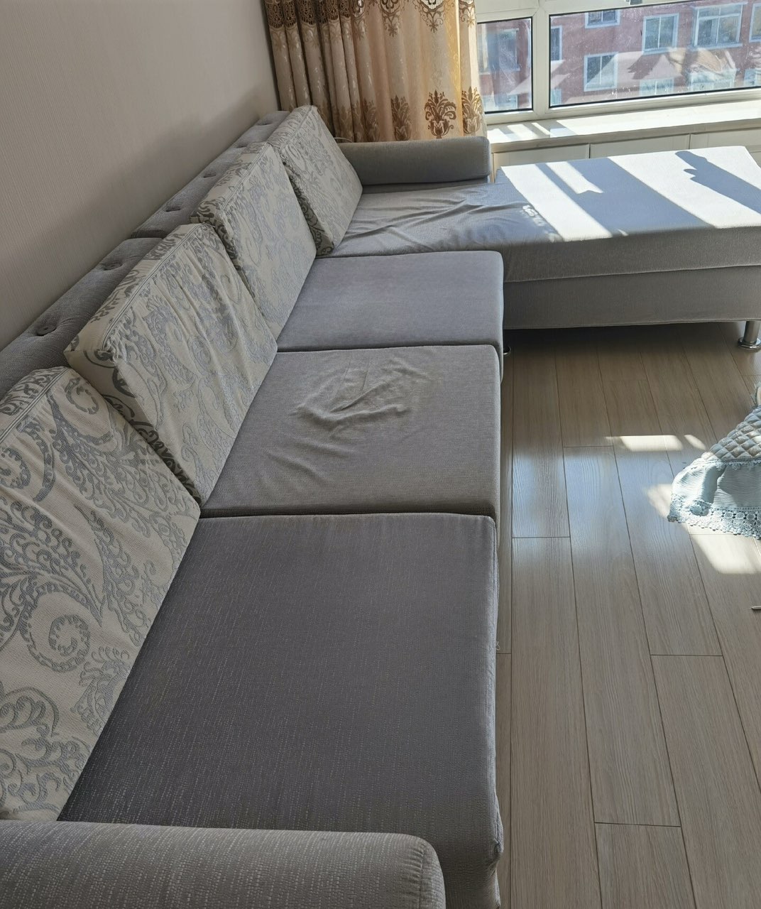 布艺L型沙发 带贵妃位 灰色+花色靠垫 现代简约风