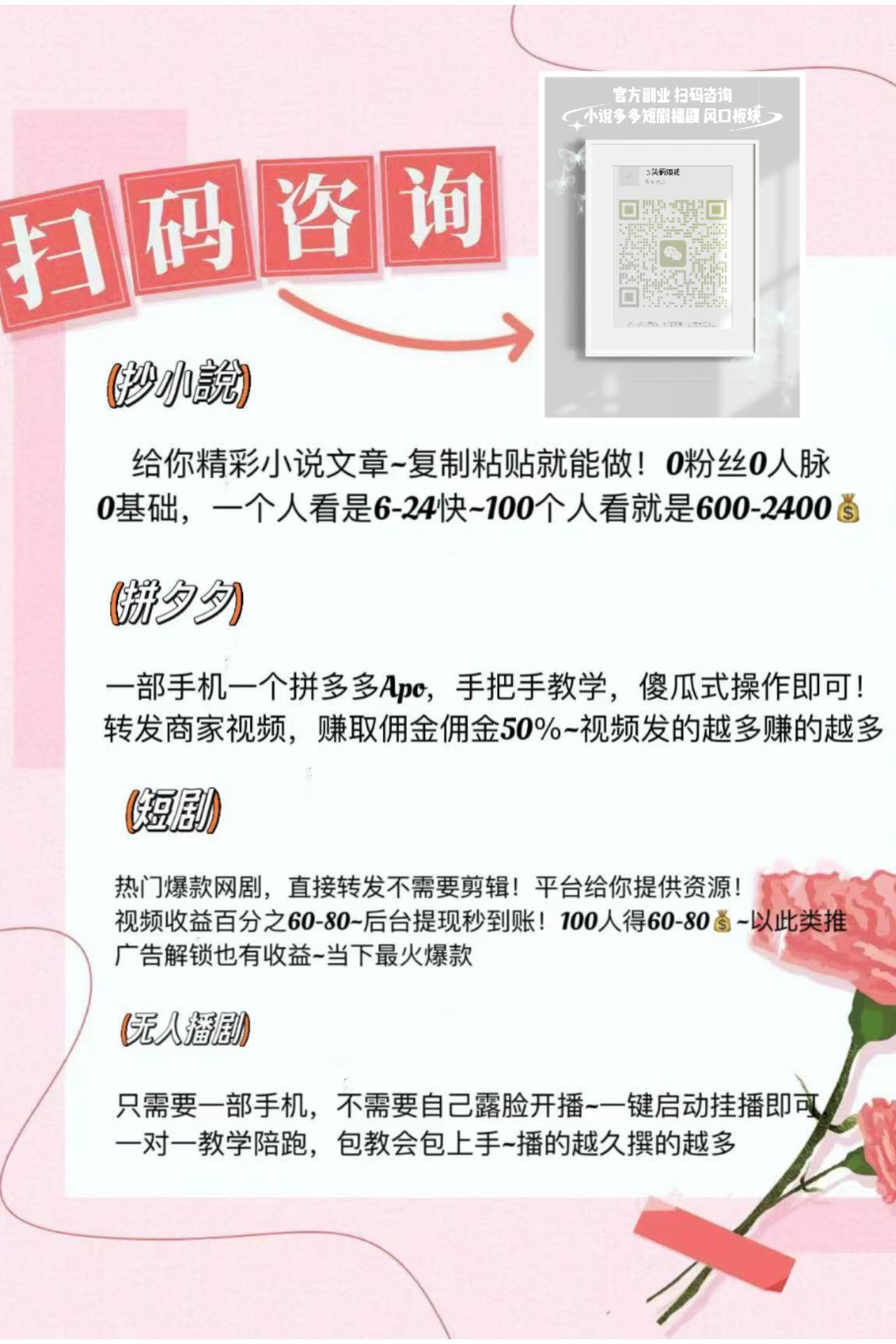 宝妈,上班族,学生党,想利用碎片时间来赚点零花钱的可以看过来,日入3位数不是问题,有需要扫码加他了解(白嫖勿扰)